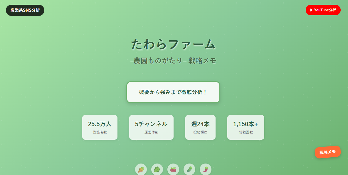 たわらファームさんは、農業系YouTubeの中で知識の網羅性 × 高頻度投稿 × 分かりやすさが高次元でかみ合ったチャンネル設計をしています。視聴者が「ここを見れば野菜づくりは大丈夫」と感じるための仕組みが整っており、初心者から上級者まで幅広い層に支持される体制が構築されています。