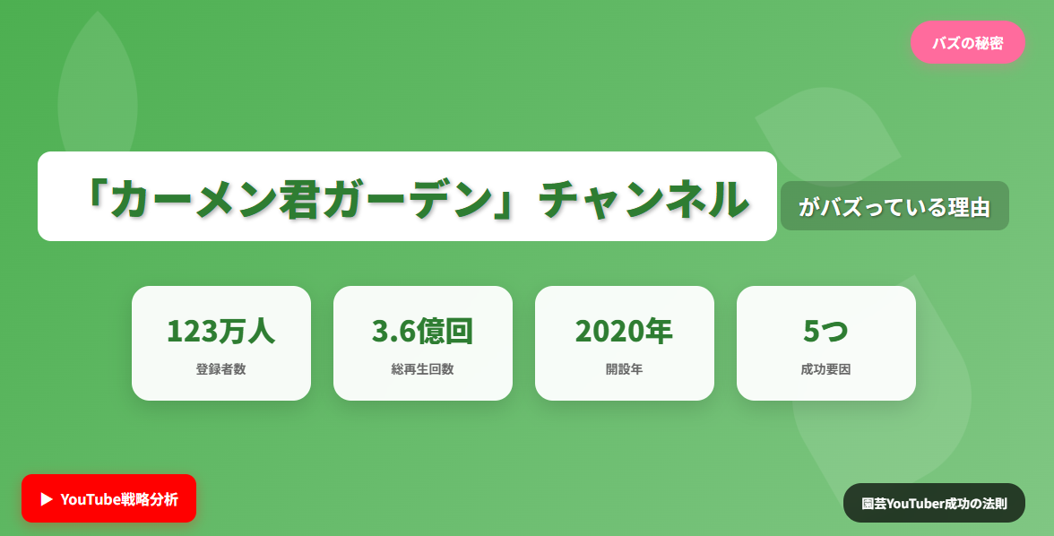 「カーメン君ガーデンチャンネル」は、専門知識の深さとキャラクターの親しみやすさを融合させ、さらにマーケティング戦略を的確に仕掛けることで、園芸分野では異例の登録者数100万人超を達成しました。